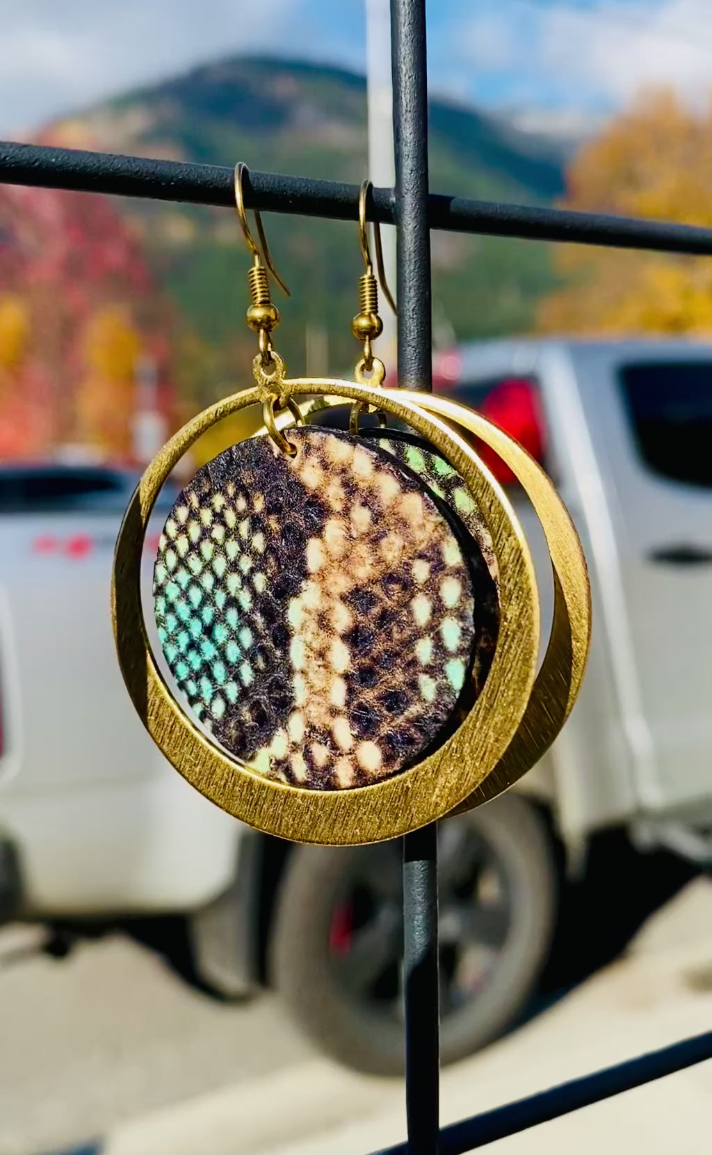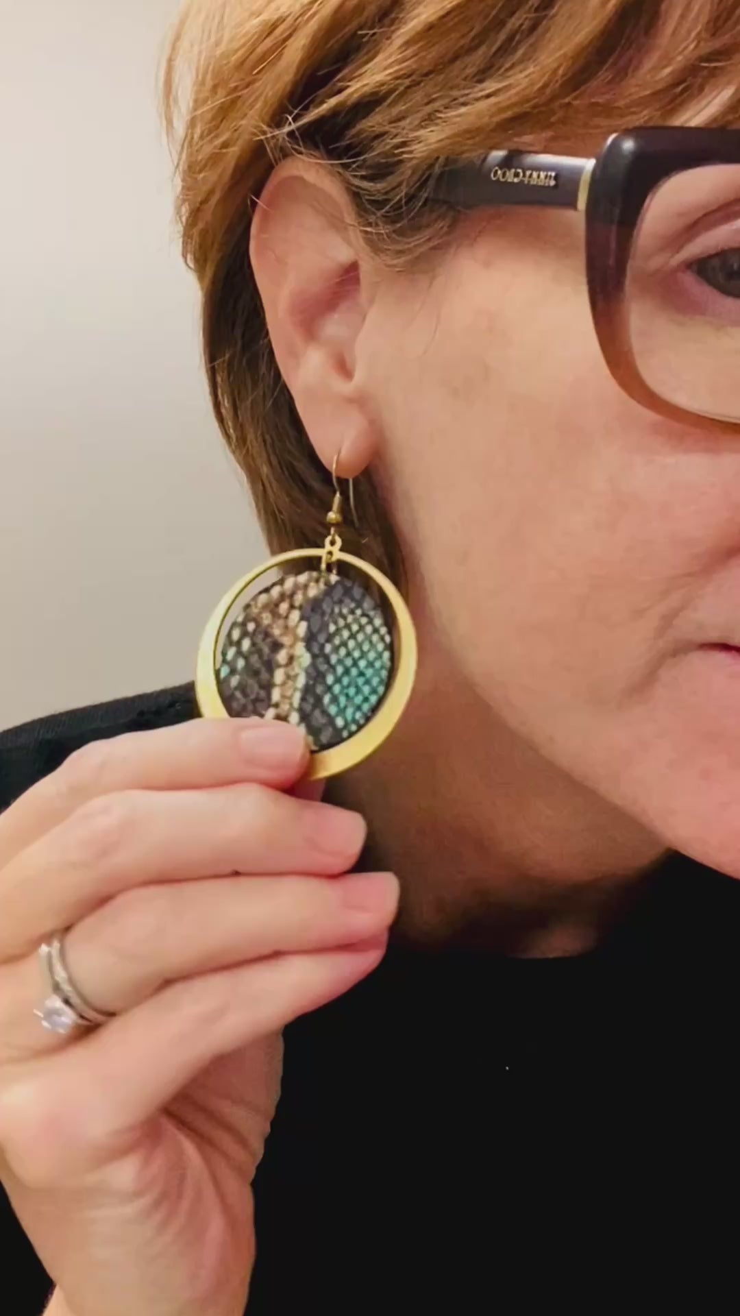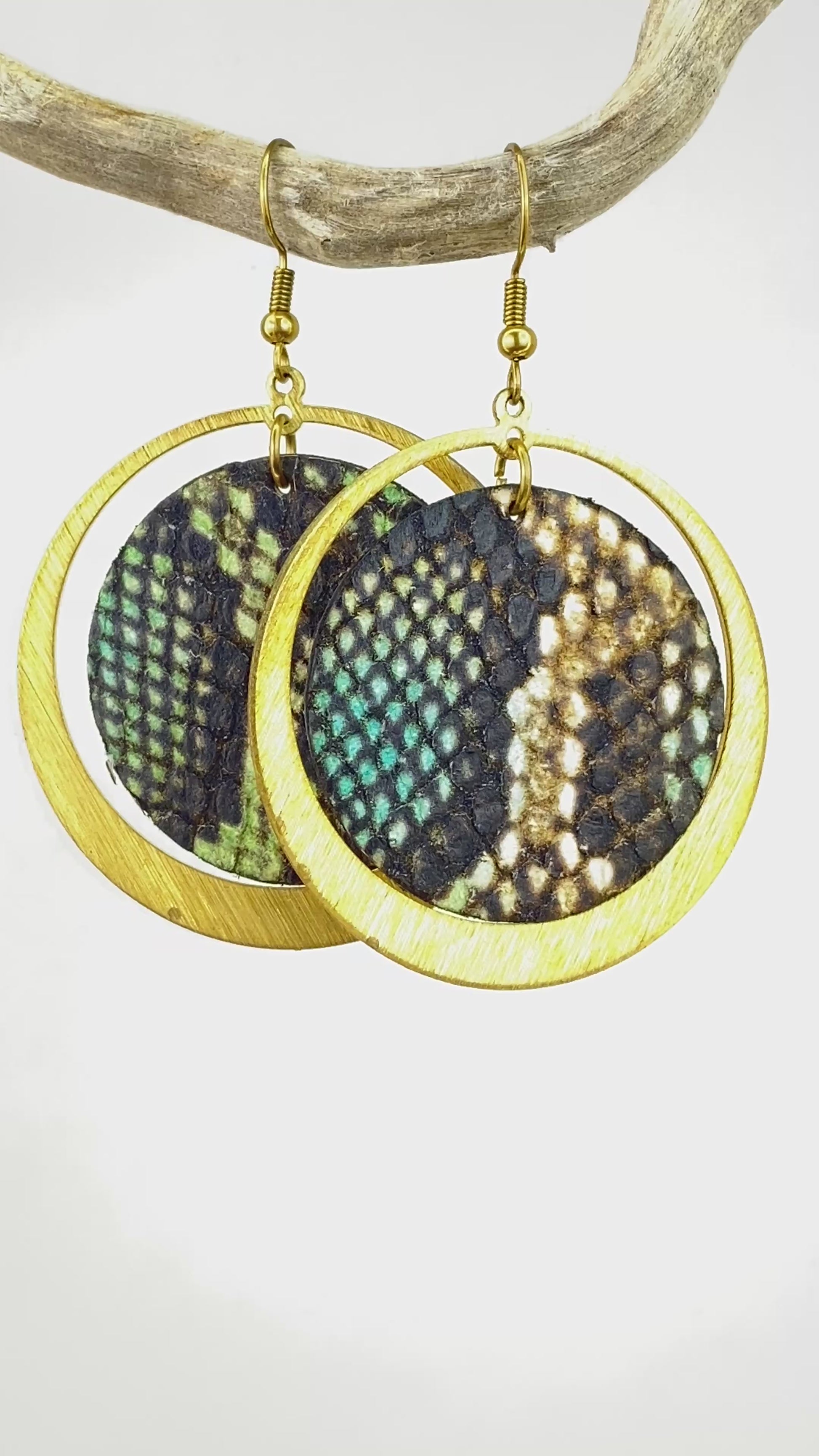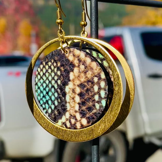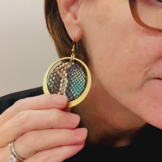 Multicoloured snake print leather with teal leather back surrounded by a warm brass hoop. Like you, they're really cool.