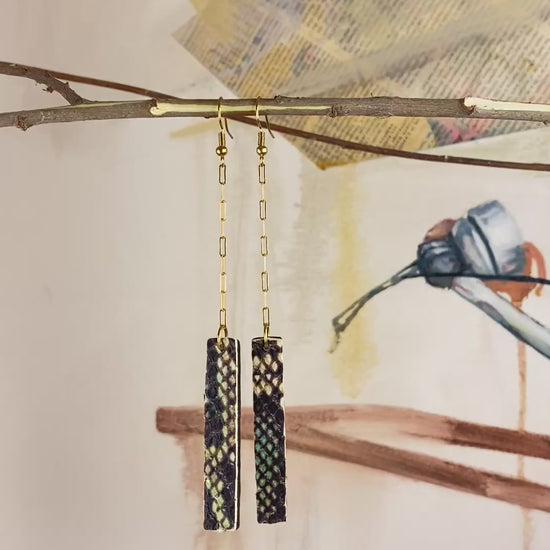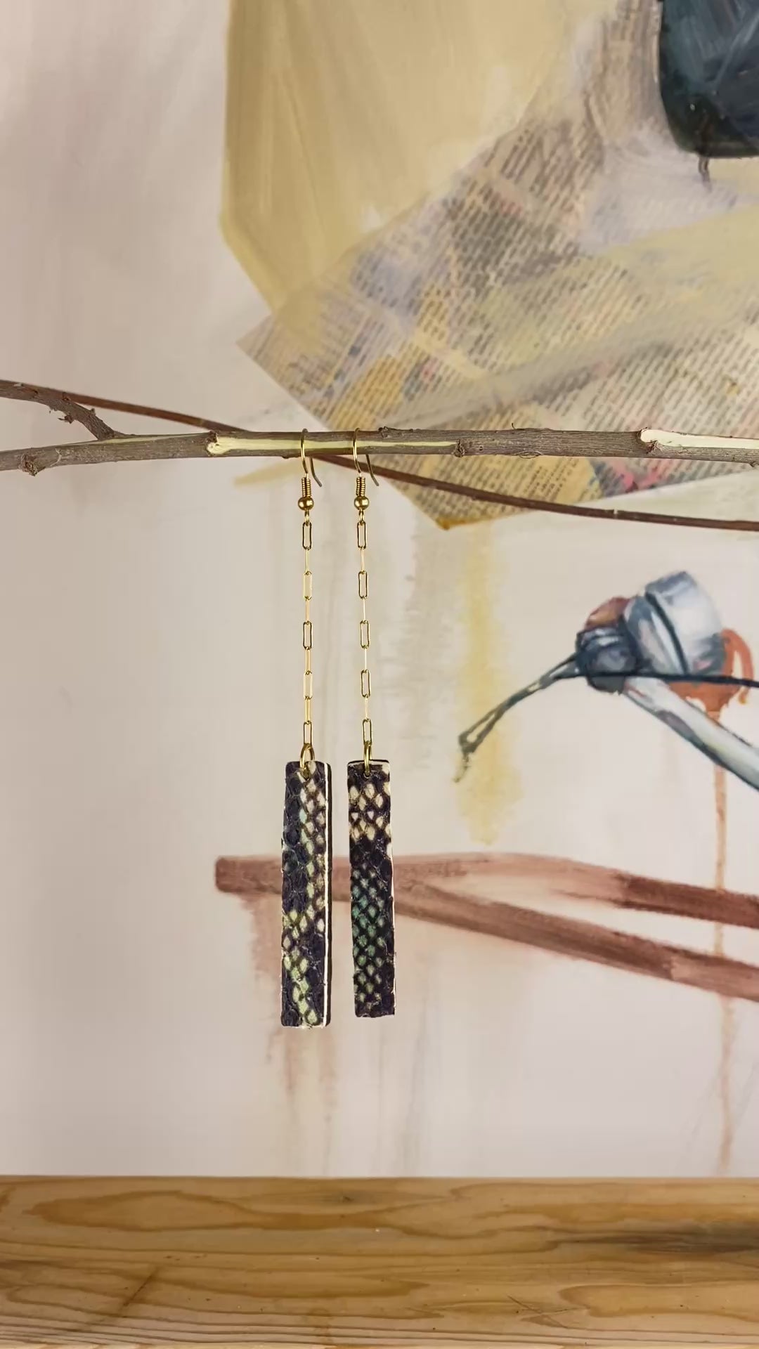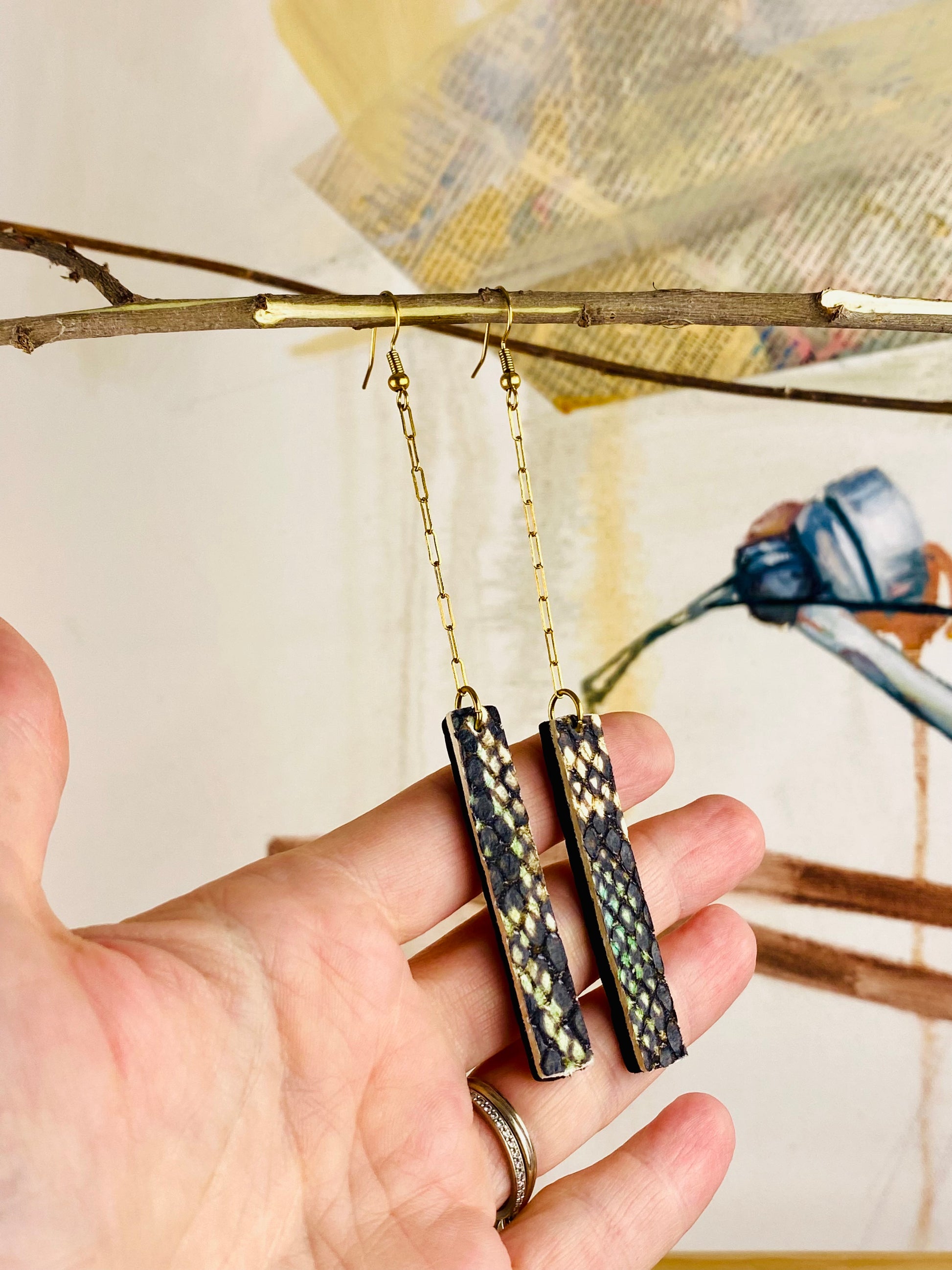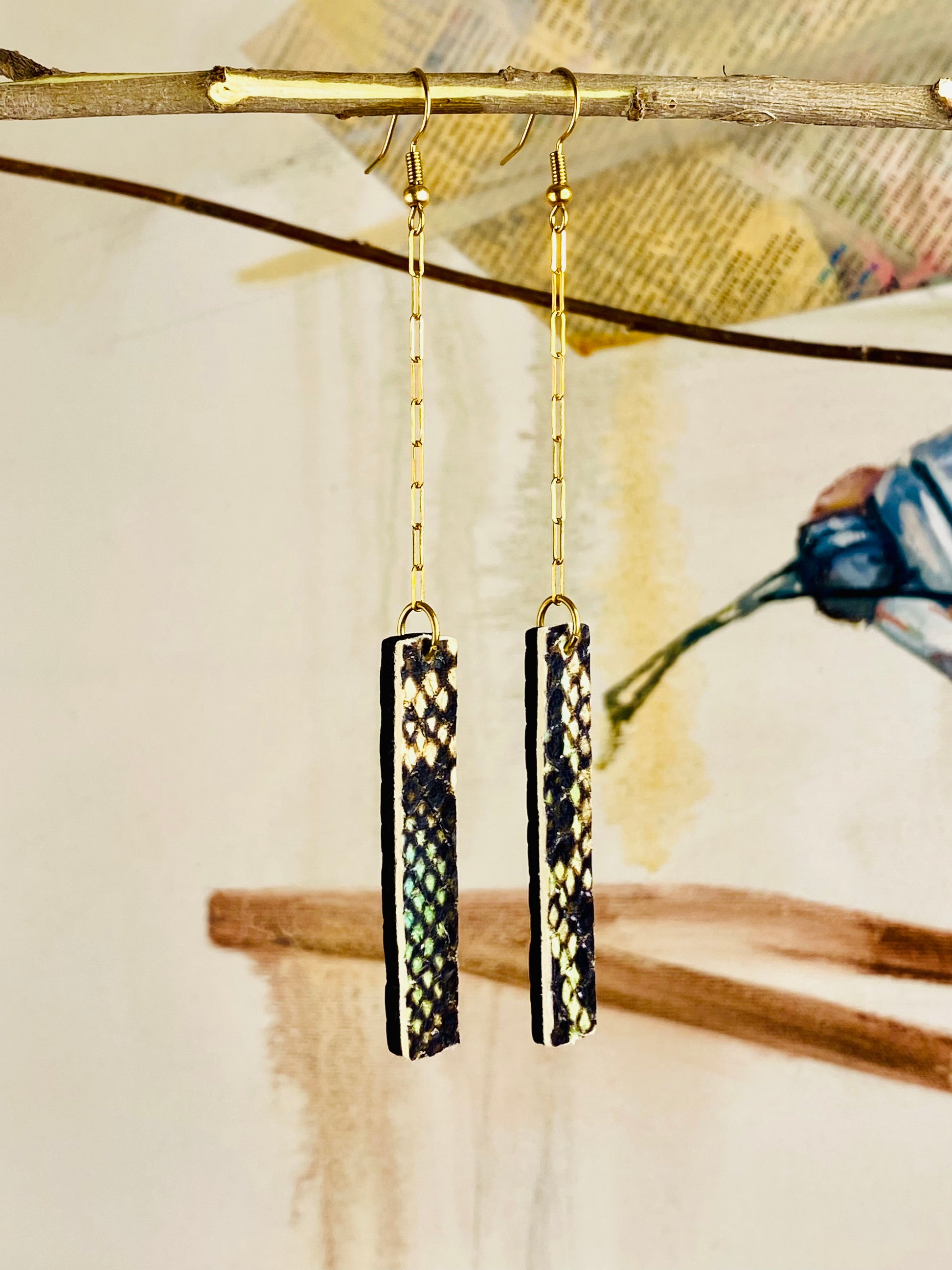 Modern minimalist leather earrings to add a touch of cool to your style. These beauties are double-sided with black pebbled leather at the back and snake print in the spotlight.