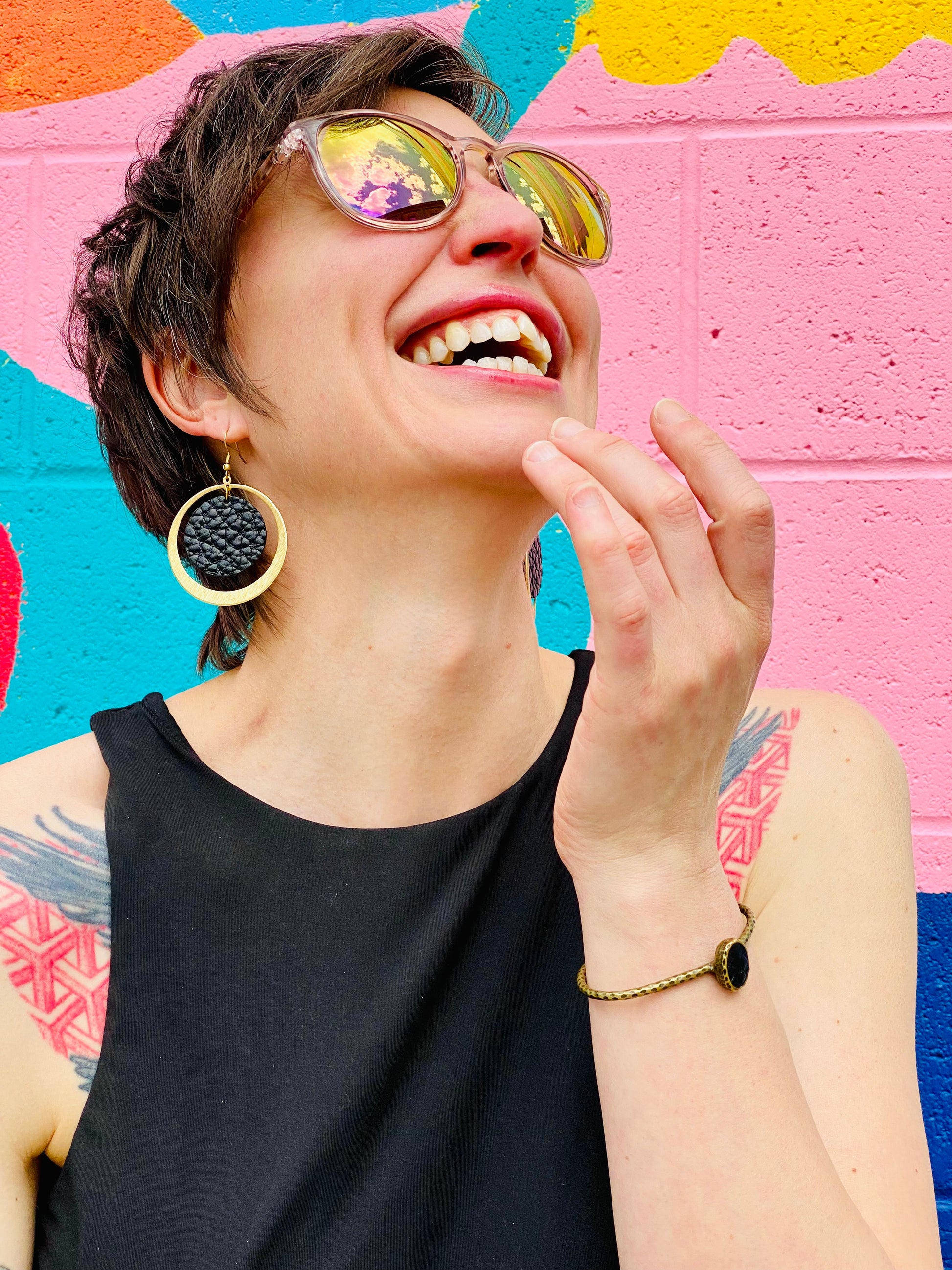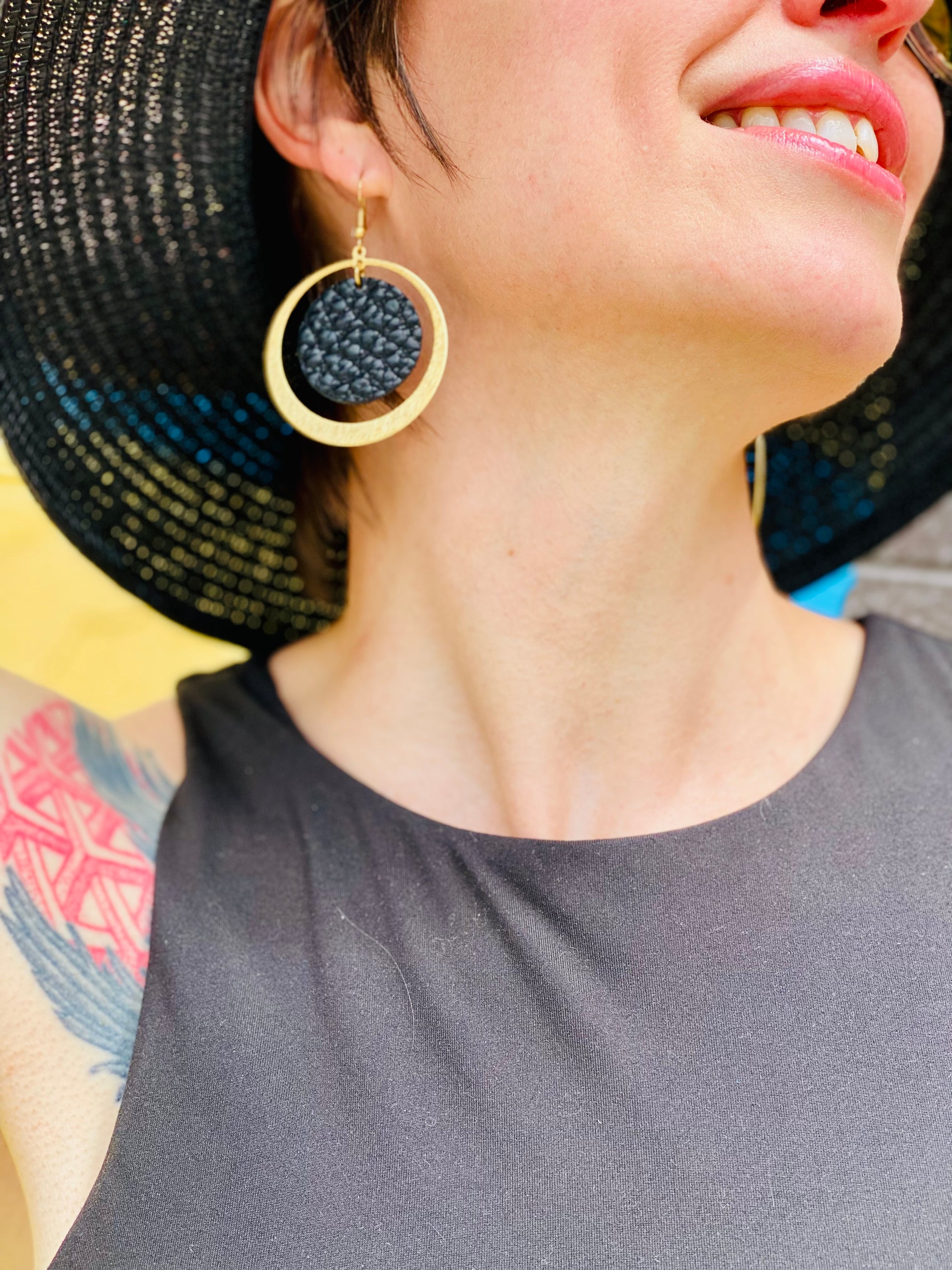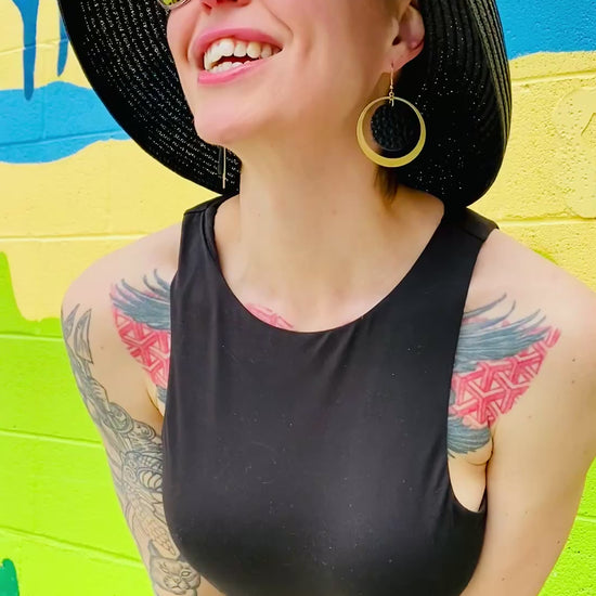 The perfect double circle hoop earrings made with texturized brass and black pebbled leather.