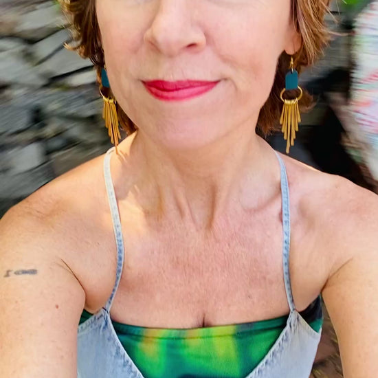 From the Holiday Collection, our Bask earrings. And this colour combo, am I right? Brass and Mediterranean teal will have you feeling like you're on vacation already, warming your skin and your mood.